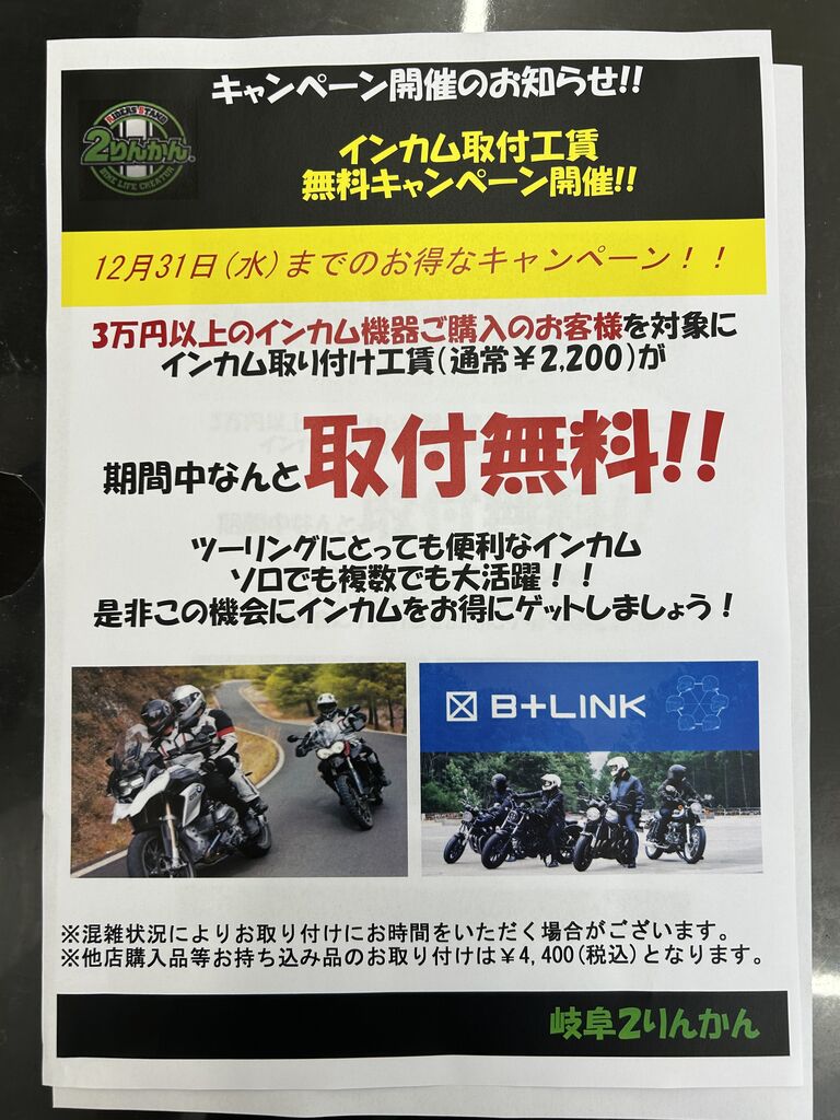 当店でお買い上げのお客様は通常2200円で取り付け致しますが今月中であれば3万円以上のインカムお買い上げで取り付け工賃をサービス致します!!ヾ(´ω`=´ω`)ノ