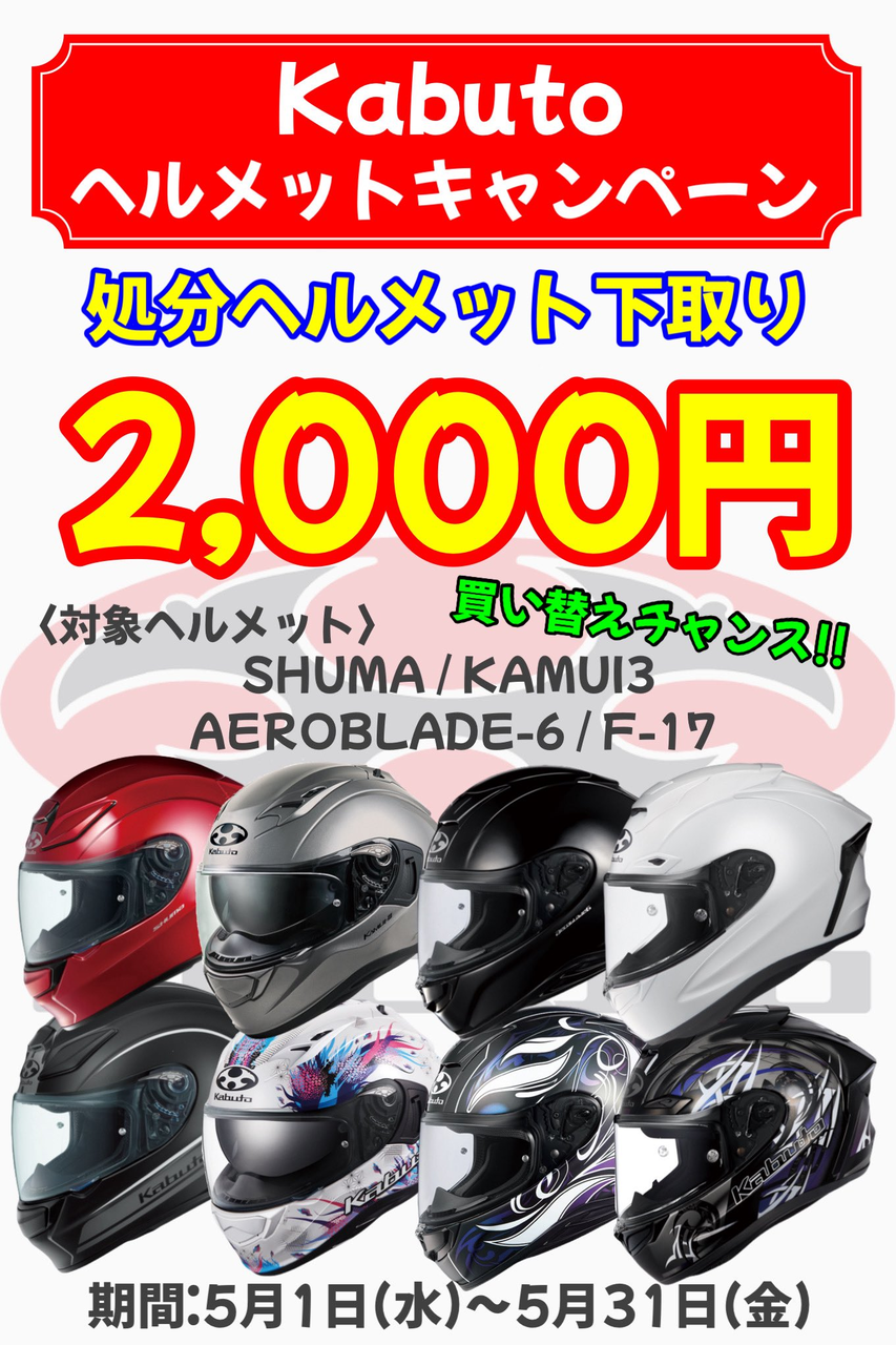 カブトの対象ヘルメットをご購入お客様の処分ヘルメットを2,000円にて下取りさせていただきます。