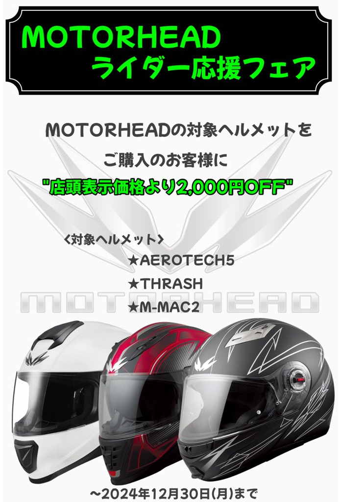 門真2りんかんではMOTORHEADライダー応援フェアを開催します。冬休みシーズン到来ということもあり、MOTORHEADの対象ヘルメットをより手に取っていただきやすい価格(店頭表示価格より2,000円引き)にて販売させていただきます!!