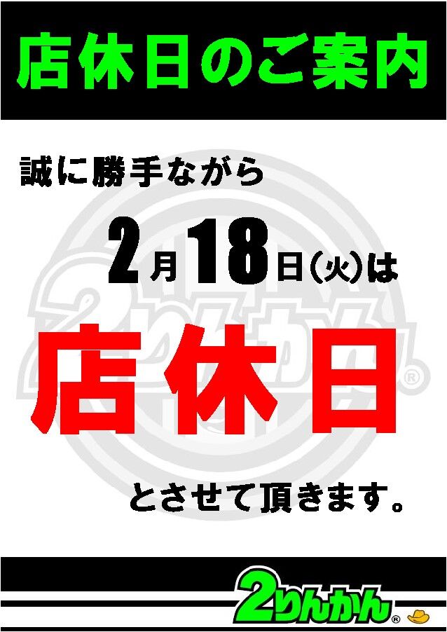 誠に申し訳ございませんが、2月18日(火)は店休日とさせて頂きます。
