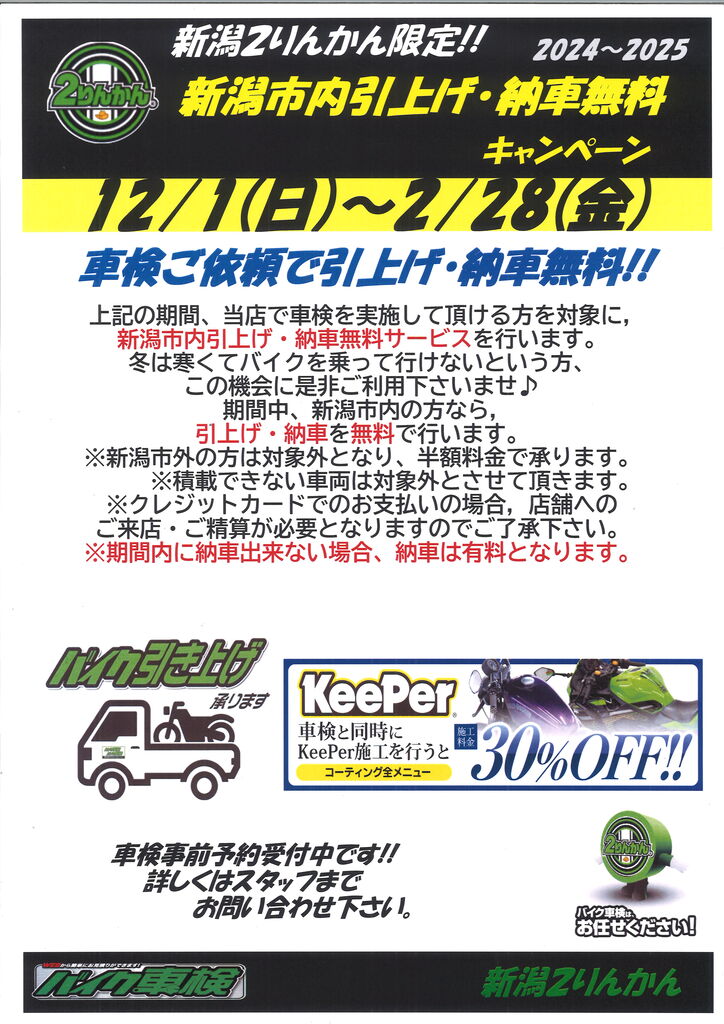 只今、新潟2りんかんでは、車検引上げ納車無料キャンペーンを実施中です