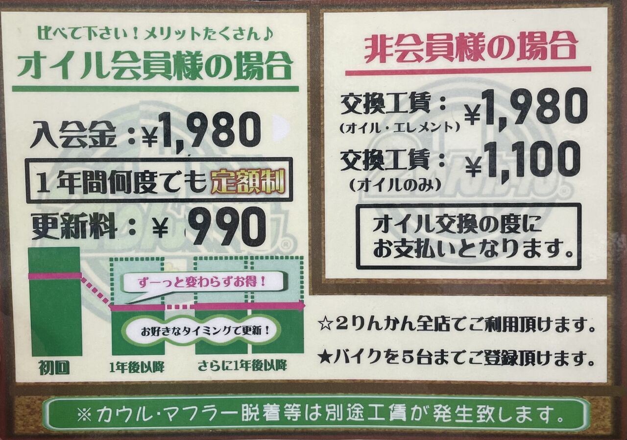 ¥ª¥¤¥ë²ñ°÷¤ËÆþ²ñ¤µ¤ì¤Æ¤¤¤Ê¤¤¾ì¹ç¡¢¥¨¥ó¥¸¥ó¥ª¥¤¥ë¸ò´¹¤Îºî¶È¹©Ä¤Ï1,100±ß¡£¥¨¥ó¥¸¥ó¥ª¥¤¥ë¤È¥ª¥¤¥ë¥¨¥ì¥á¥ó¥È¤ÎƱ»þ¸ò´¹¤Ç1,980±ß¤Îºî¶È¹©Ä¤Ȥʤê¤Þ¤¹¡£¤½¤³¤Ç¡ª¥ª¥¤¥ë²ñ°÷¤ËÆþ²ñ¤¹¤ë¤È1²óʬ¤Î¶â³Û¤Ç1ǯ´Ö̵ÎÁ¤Ë¤Ê¤êÂçÊѤªÆÀ¡ª¤Þ¤¿¡¢°ì¿Í¤Ç¤¤¤í¤¤¤í¤Ê¥Ð¥¤¥¯¤ò½êͤµ¤ì¤Æ¤¤¤ëÊý¤â¿¤¤¤Ç¤¹¤¬¡¢£²¤ê¤ó¤«¤ó¤Î¥ª¥¤¥ë²ñ°÷¤ÏÆóÎØ¼Ö¤ò5Âæ¤Þ¤ÇÅÐÏ¿¤âOK¡ª