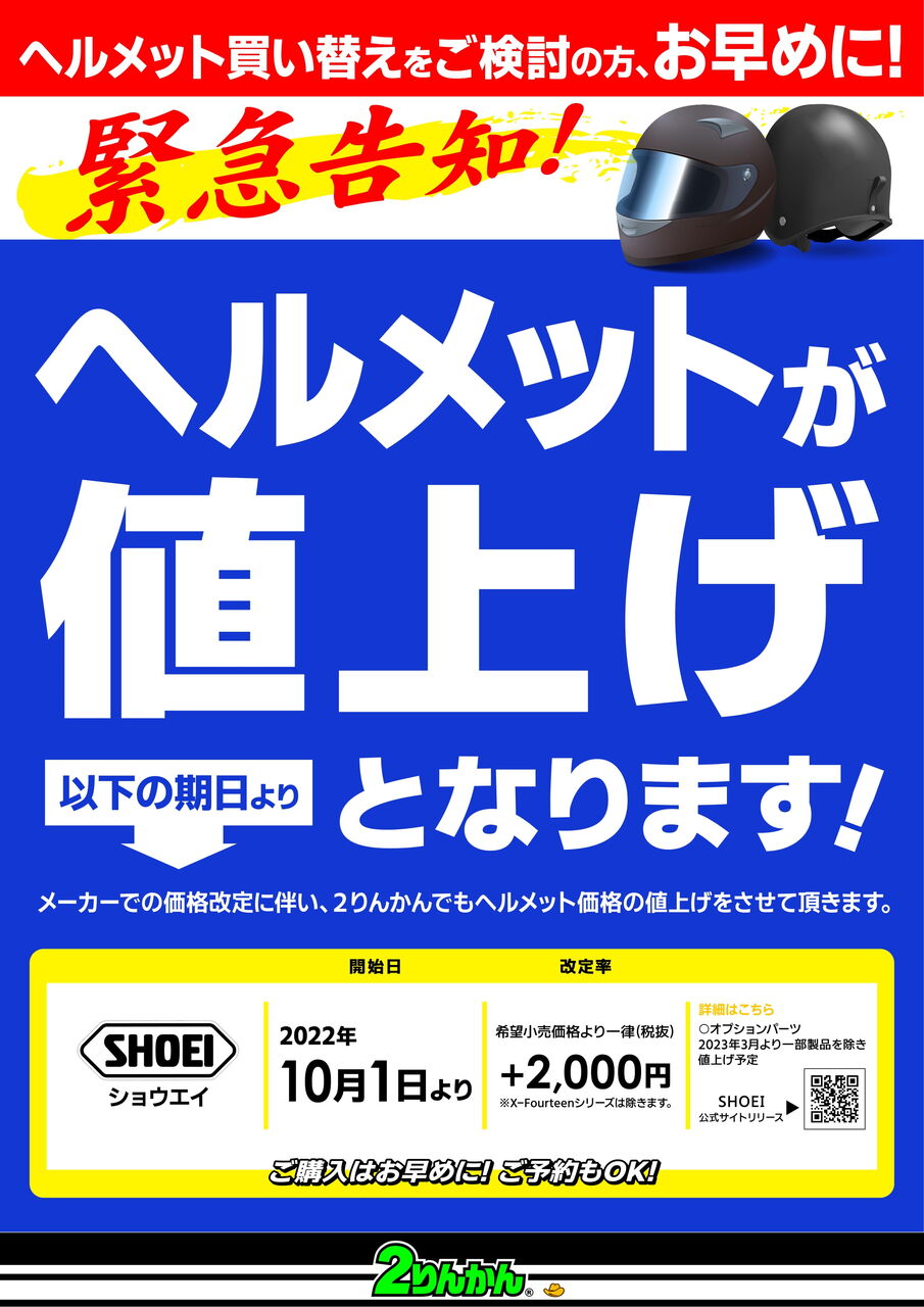 上尾2りんかん SHOEIヘルメットが値上げ・・・・
