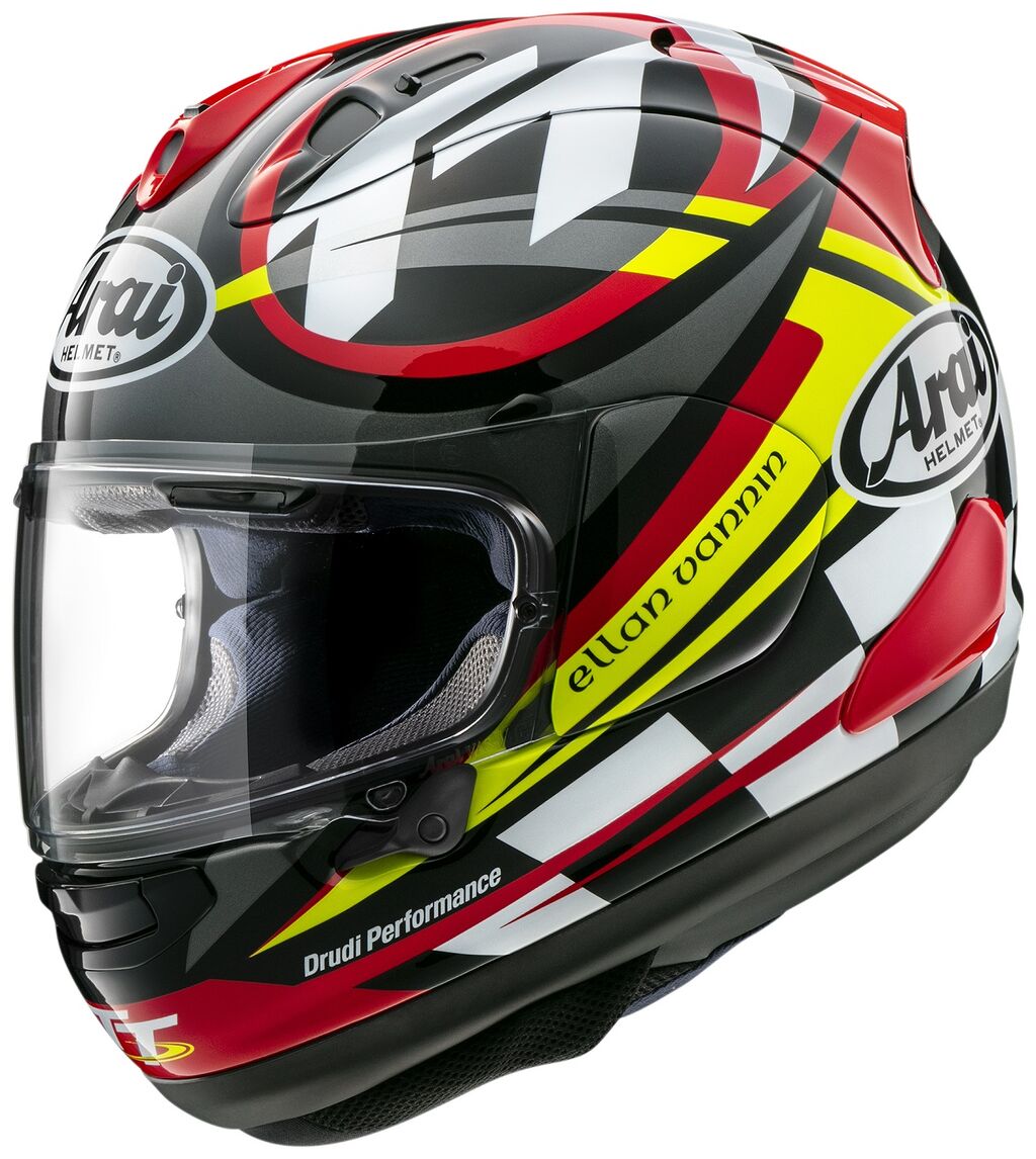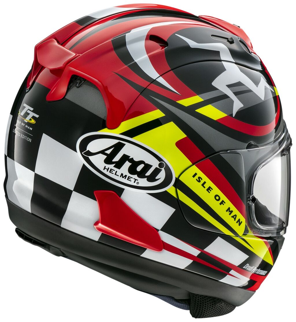 このモデルは多くのArai製品のデザインを手掛けている“ドゥルディーパフォーマンス”によるもので、ブラックを基調にマン島のエンブレムである三脚巴:トリスケリオンをゴールドで配置し、TTのロゴをブラックとレッドでデザインされています!