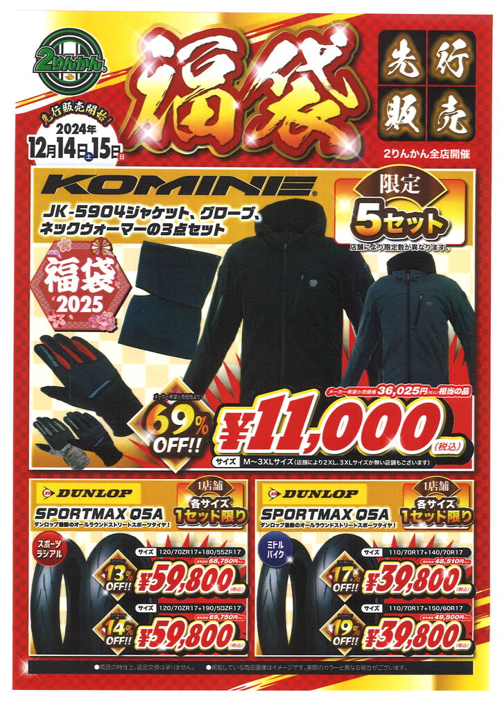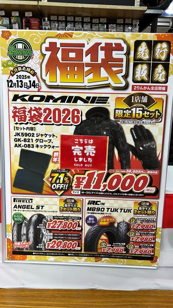 246溝口2りんかん 【246溝口2りんかん】2日間限定!!-コミネ&ピレリ&iRC- 福袋先行販売いたします【12月13日(土)14日(日)】