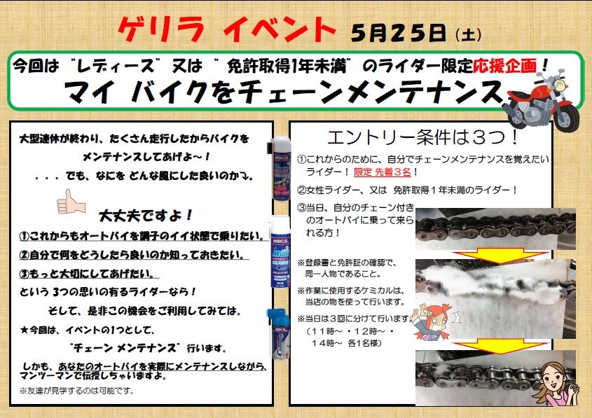 º£²ó¤Ï¡¢ÂоݼԤȤ·¤Æ¡ÚÌȵö¼èÆÀ1ǯ̤Ëþ¤Î½é¿´¼Ô¥é¥¤¥À¡¼¤µ¤ó¡Û¤«¡¢¡Ú½÷À¥é¥¤¥À¡¼¤µ¤ó¡Û¤Ç¡¢ÅöÆü¥Á¥§¡¼¥ó¶îư¤Î¥Ð¥¤¥¯¤Ë¾è¤Ã¤ÆÍè¤é¤ì¤¿Êý¸ÂÄê3̾Íͤˡ¢Ï¸÷¥±¥ß¥«¥ë¥¹¥¿¥Ã¥Õ¤¬ÃúÇ«¤ËÀâÌÀ¤·¤Ê¤¬¤é¡¢¥É¥é¥¤¥Ö¥Á¥§¡¼¥ó¥á¥ó¥Æ¥Ê¥ó¥¹¤ò¥¤¥Ù¥ó¥È¥Ö¡¼¥¹Æâ¤Ç¹Ô¤¤¤Þ¤¹¡£¤·¤«¤â¡¢¤Ê¤ó¤È̵ÎÁ¤Ç¤¹¡ª¡ª