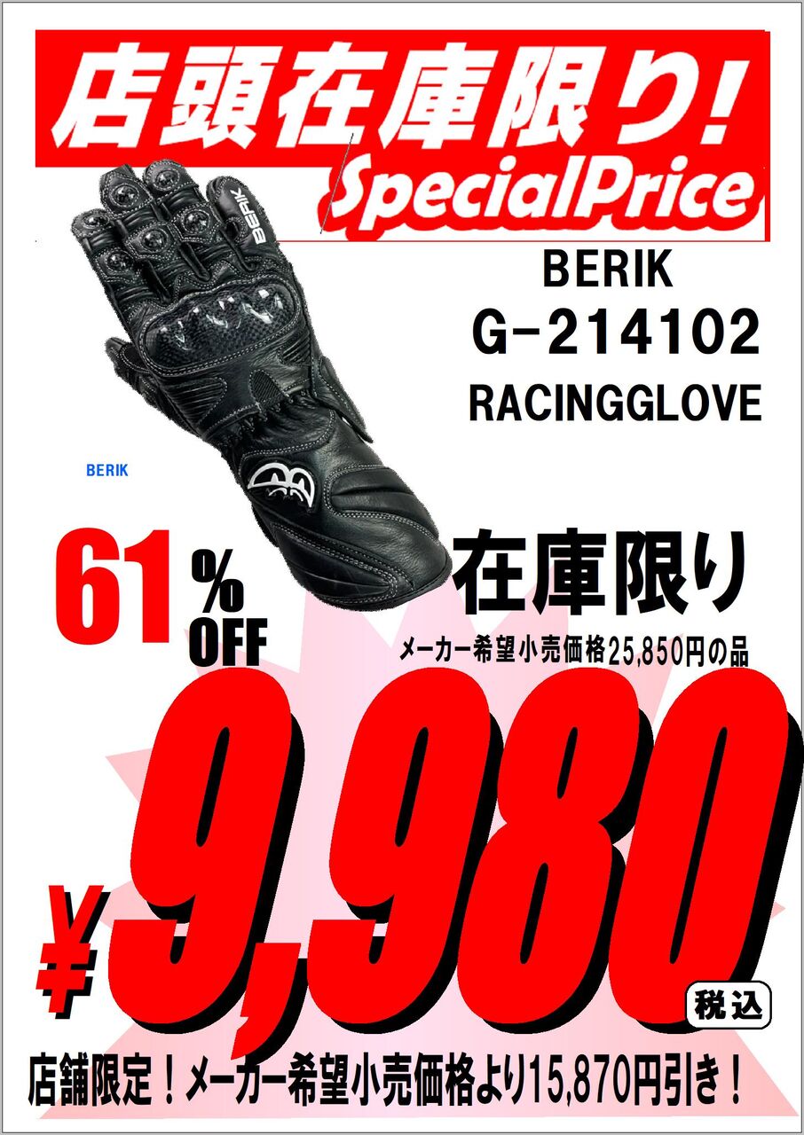 千葉北2りんかん 【千葉北2りんかん】BERIK 牛革レーシンググローブが、ずばり9,980円!