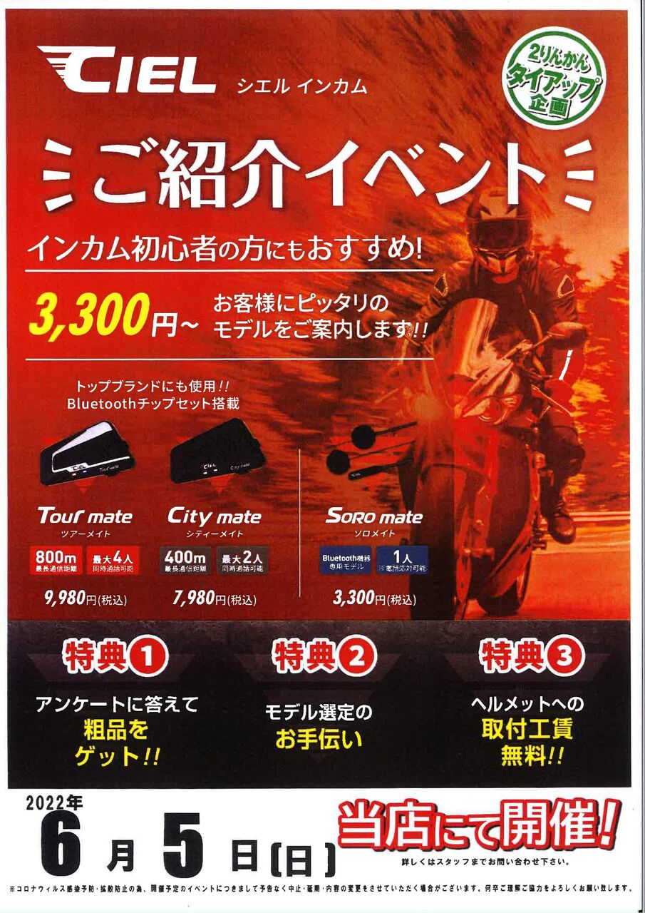 ミラーシールドがもらえるKabutoのフィッティングサービスやマフラー大商談会、カスタムパーツの無料取り付け等めちゃめちゃお得なイベント盛りだくさんでお届けいたします