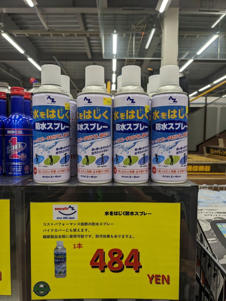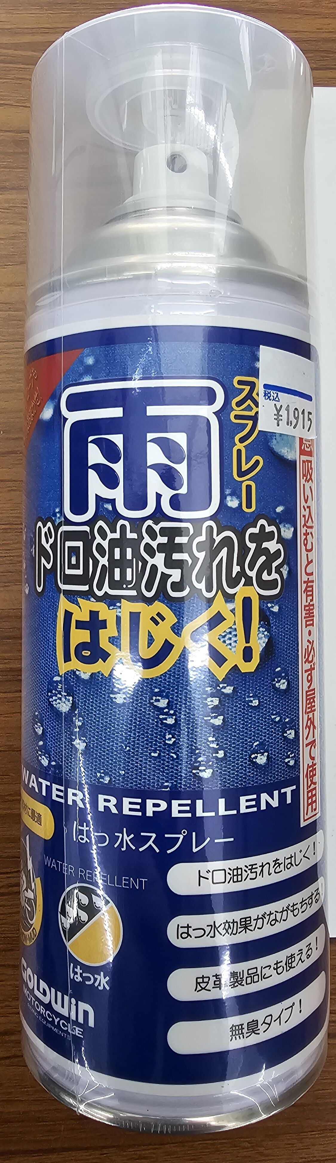 AZ製防水スプレーでございます。お値段598円でございます。水をはじくのでツーリング行く前や出先での雨や山岳地帯の出発前にぜひご活用ください。容量420mlとなっておりますので携行しやすいサイズであります。
