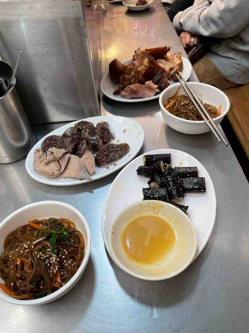 市場の屋台でスンデとチャプチェと豚足と海苔巻きも食べました