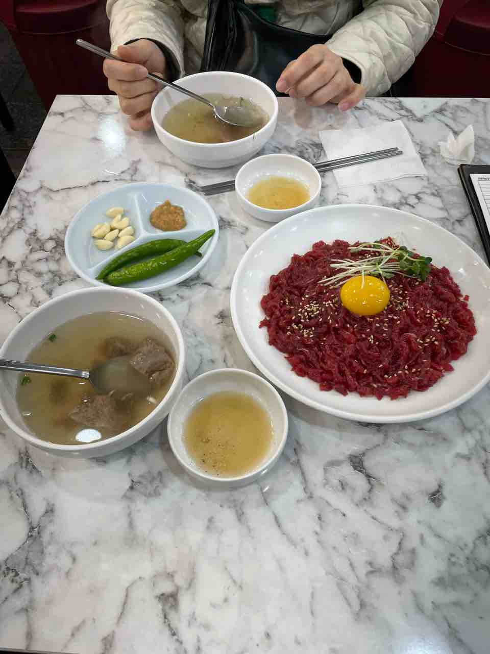 ユッケはお肉の下に梨があって肉と一緒にごま油につけて食べるとめちゃめちゃおいしいです