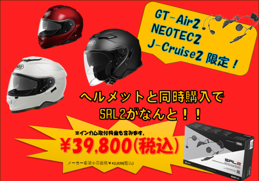 上記SHOEIの3モデル限定になりますが、ヘルメットとSRL2をセットでお買い上げの方はSRL2が¥39,800(税込)でお買い求めできます