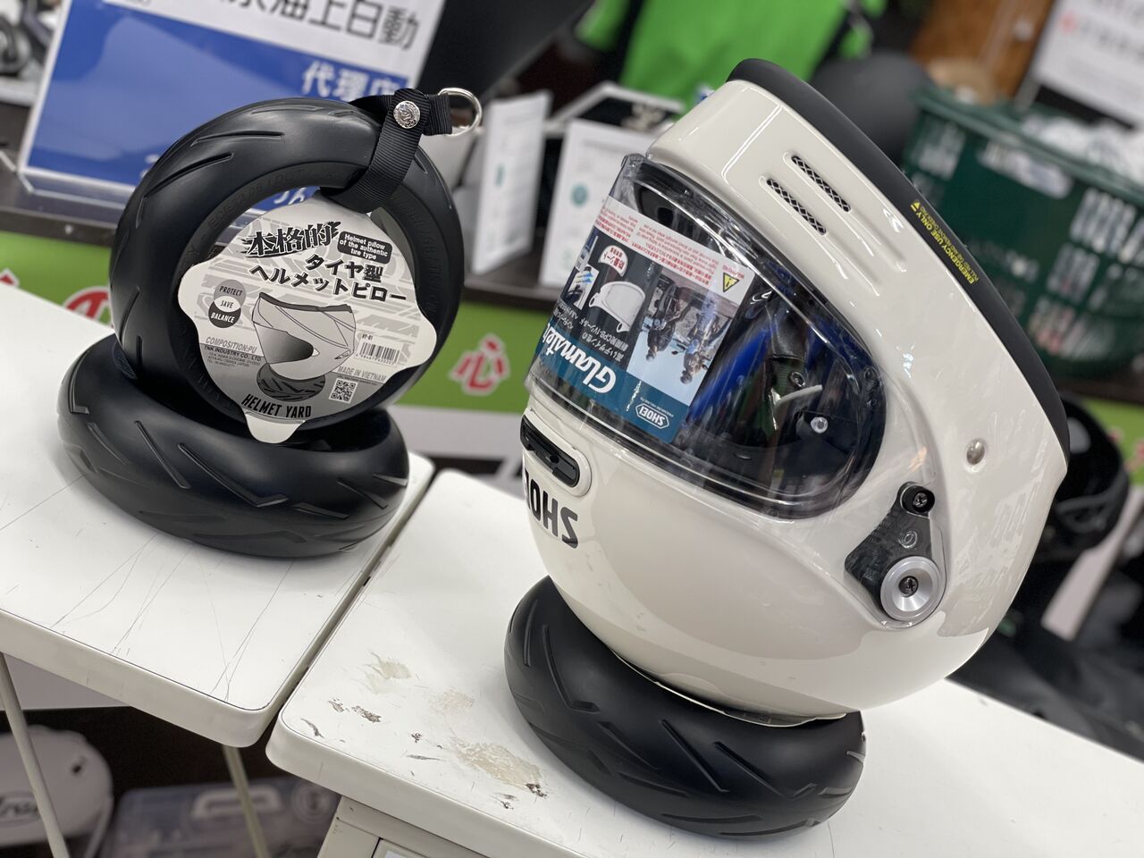 タイヤの形をしたヘルメットピローですが、こちらはヘルメットのメンテナンスや保管時に置いておく。