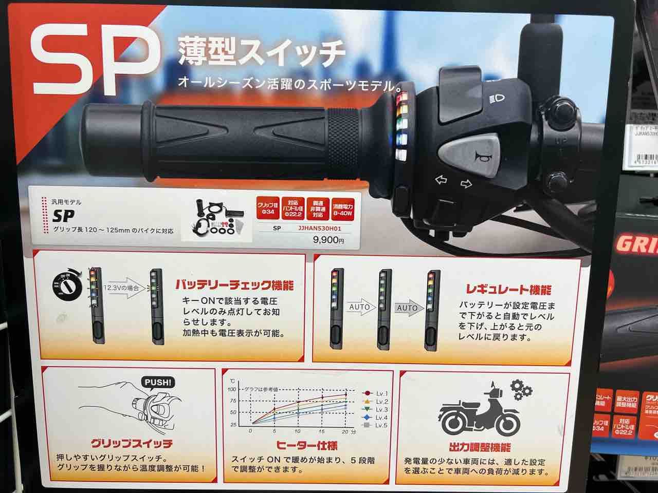 電圧は信号機のように色で判断しグリップにスマートに取り付けができるタイプのSPシリーズは12/14までの期間限定価格9,980円でご用意があります。