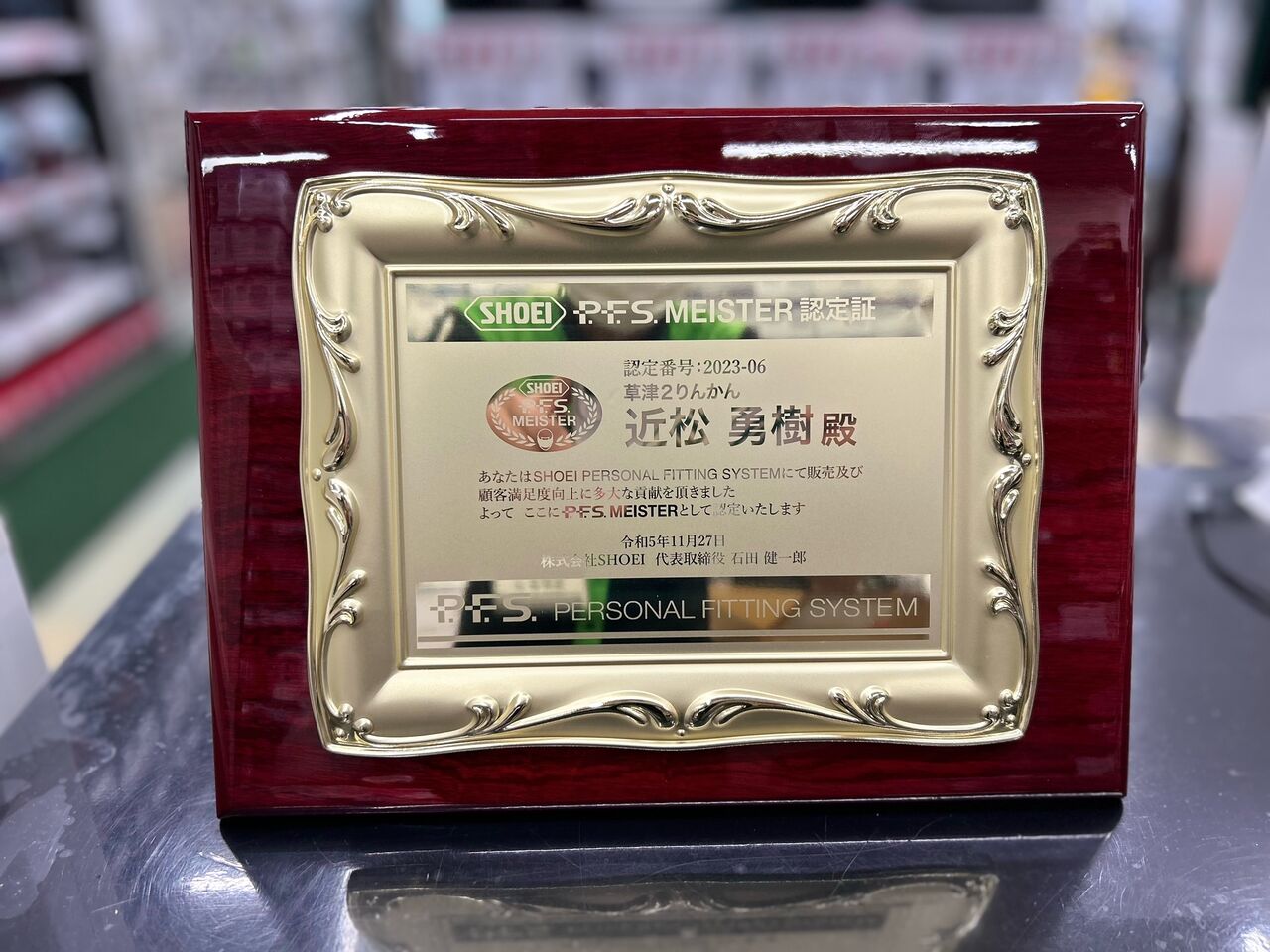 前のブログでもお話ししましたが実はSHOEIヘルメットのPFSマイスターに2りんかんで初めて選ばれまして・・・今のところ全国の2輪用品店には数名しかおりません。