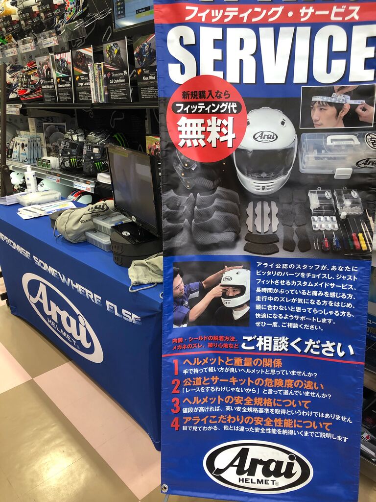 ヘルメットメーカーで有名なAraiさんが本日購入者限定で、フィッテングサービスをしてくれます