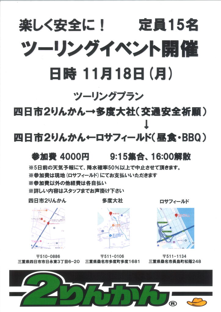さらに告知させていただきますが、四日市2りんかん主催の「ツーリング」イベントになります。