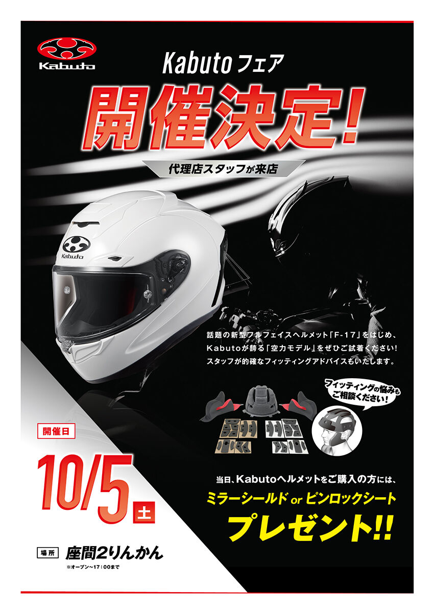 10/5(土)はカブトさんのヘルメットフィッティングイベント開催です